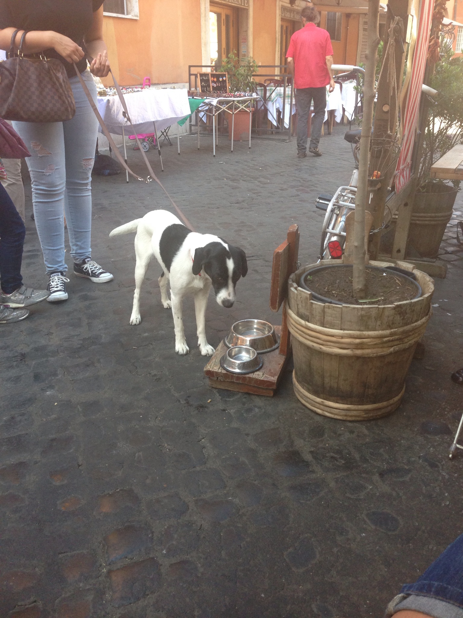 Baarin edessä on koirille tarkoitettu vesikuppi, jonka äärellä vierailijoita on seuraa mielikseen.