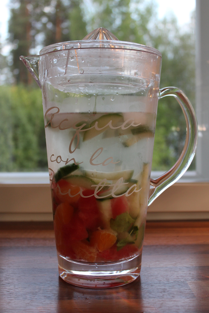 Kuori mandariini ja puolita jokainen lohko. Kuori greippi ja viipaloi se. Jos laiskottaa, pelkästään viipaloi se. Kurkun voi paloitella suikaleiksi. Muutama mintunlehti joukkoon, pari kouralllista jäitä ja päälle kylmää vettä. Sekoita ja nauti! Vettä voi lisäillä kannuun sitä mukaa kun se tyhjenee.