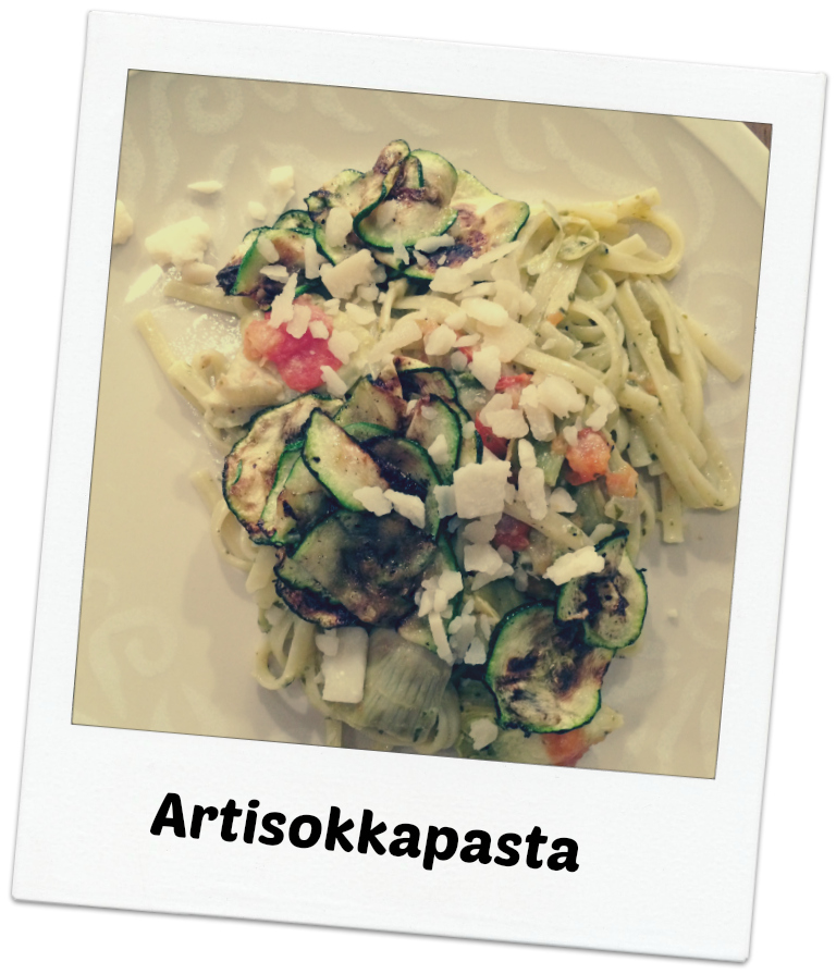Pilko sipuli & valkosipulinkynnet ja kuullota ne pannulla öljyssä. Lisää pienennetyt artisokansydämet ja puolitetut kirsikkatomaatit, pesto ja mausteet. Kaada seos uunivuokaan ja lämmitä 180 asteessa sen aikaa, kun keität pastan. Leikkaa kesäkurpitsasta juustohöylällä lastuja ja paista ne öljyssä. Lisää keitettyyn pastaan 1-2 dl kaurakermaa. Ota artisokkaseos uunista ja kippaa kattilaan pastan sekaan. Sekoita. Sekaan vielä parmesania & paistetut kesäkurpitsasiivut ja notta ristus, on hyvää!