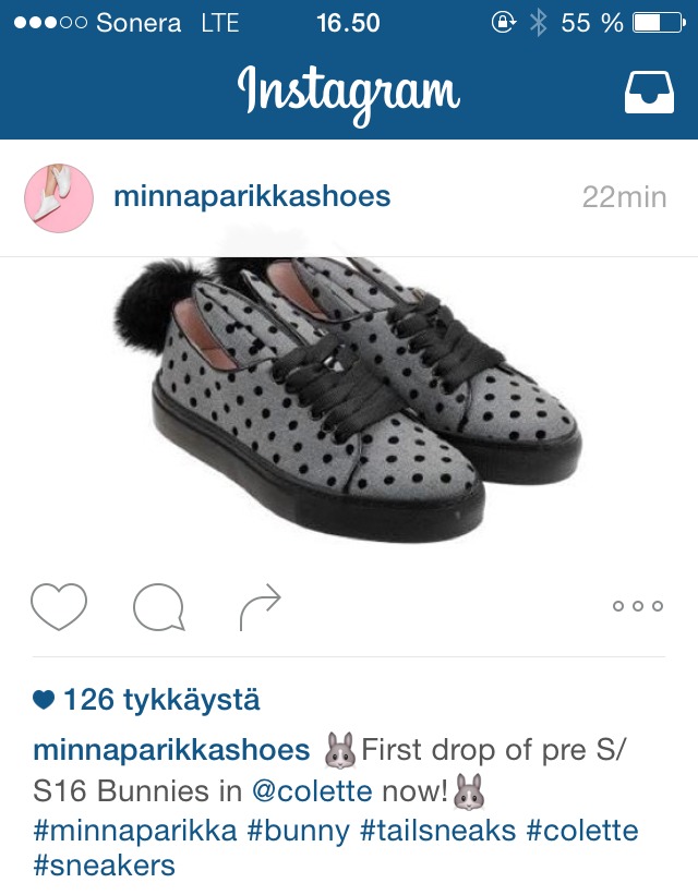 Näin noiden kenkien esittelyn instassa ja alaleuka loksahti sillä istumalla. Kommentoin kuvaa ja kysyin, onko niissä oikeasti käytetty turkista. Sain nopeasti asiallisen vastauksen, jossa kerrottiin, että kyseessä on espanjalaislähtöinen kaninkarva; Espanjassa kun syödään paljon pupuja.