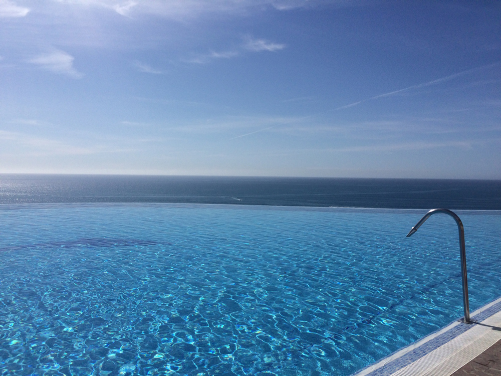 Ylimmän kerroksen uima-allastasanteelta näkyy kivasti alemman osan uima-allas, jossa voisi pulikoida ikuisuuden merelle katsellen.