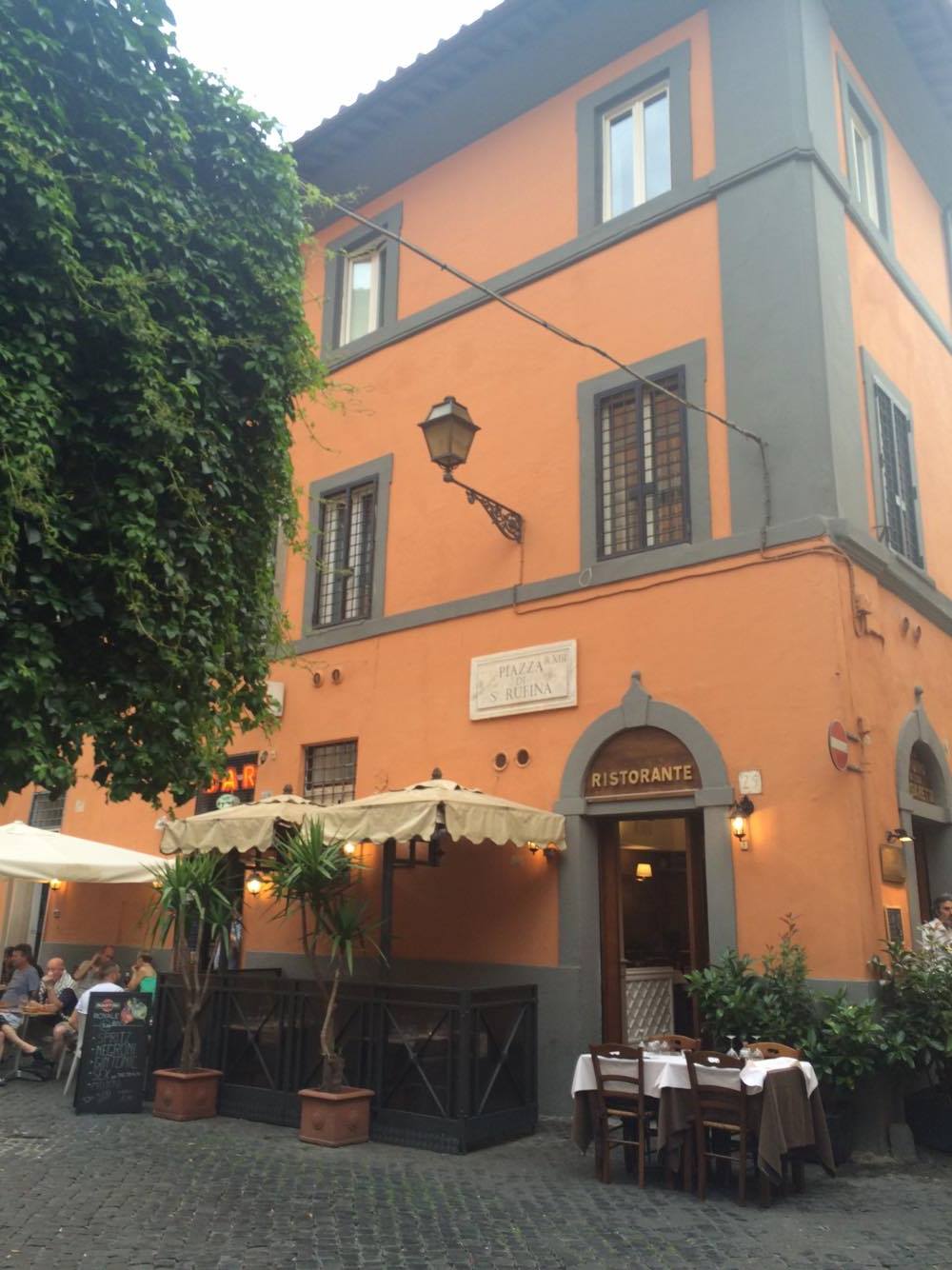 Spottasimme ravintolan ensimmällä Trasteveren-turneellaamme – tai oikeammin huomiomme kiinnittyi sen terassilla oleviin koirien juomakuppeihin ja niistä vettä litkineisiin koiriin, jotka omistajineen löntystelivät ohitse. Ajatus oli herttainen. Koirat arvostivat, samoin koiraihmiset, jotka poikkeuksetta edelleen pysähtyvät ihastelemaan ravintolan vesibaaria ja sen nelijalkaisia asiakkaita.