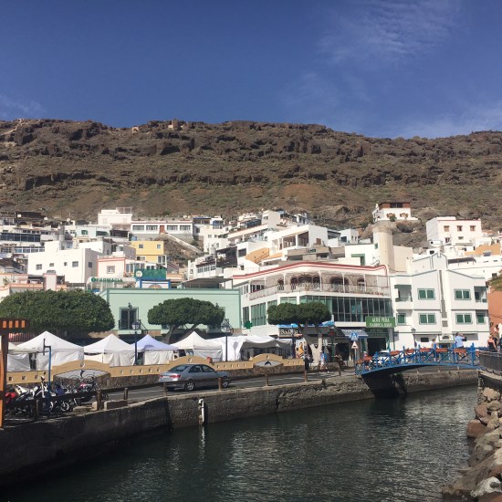 Niin ja ne markkinat: suosittelen! Kojuja ja mielenkiintoista ostettavaa (vaatteita, käsitöitä, laukkuja, kenkiä, mansikoita…) oli kaikkialla. Ja Mogan on todella kaunis ja idyllinen kylä vuorten syleilyssä. Suorastaan ihana. Harmittaa, ettemme menneet sinne jo silloin, kun hurautimme bussilla Las Palmasiin. Hukkapäivä. Kaupunki ei sytyttänyt millään tavalla ja kelikään ei ollut häävi jne. Vaan tulipahan käytyä. Merkittävin nähtävyys taisi olla Pepe Willberg pyöräilemässä 😀