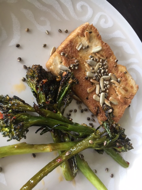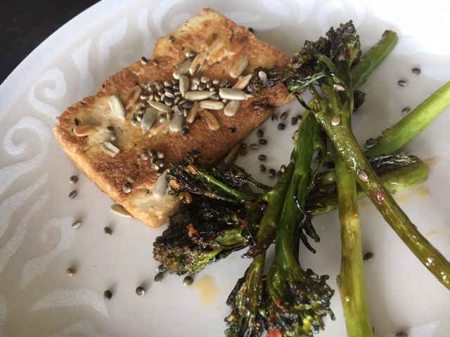 Broccolinien kypsyessä uunissa paistelin pannulla hyvin kuivatetut jalotofupihvit. Leikkasin siis valmiiksi marinoidun tofumötikän kolmeen sliceen ja nakkasin ruskistumaan. Loppuvaiheessa lisäsin sekaan auringonkukansiemeniä. Annoksen päälle laiton vielä Hamppufarmin paahdettuja & suolattuja hampunsiemeniä. Suomalainen supertuote, peukku sille.