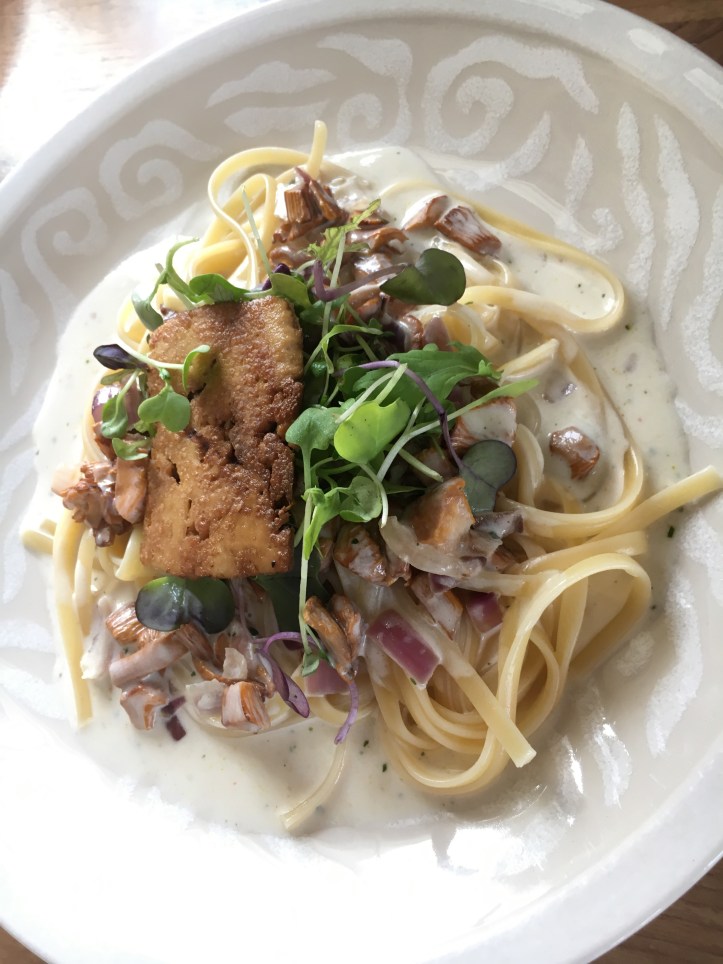 Pilkoin sienet kuivalle pannulle ja kuumensin niistä nesteet pois. Sitten loraus oliiviöljyä ja pilkotut sipulit sekaan paistumaan. Pastan kiehuessa liuotin toisessa kattilassa liemikuution pieneen nestemäärään, ja laitoin joukkoon kaurakerman sekoittaen samalla. Kun sieni-sipuliseos oli ready, kippasin sen kermakattilaan. Putsasin pannun ja paistoin rapeaksi muutaman ohuen viipaleen hyvin kuivattua savutofua. Sitten vaan safkat lautaselle, rehut päälle ja ääntä kohti 😌 #NoOneWasHarmed